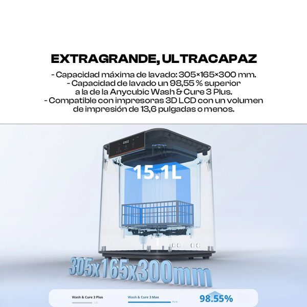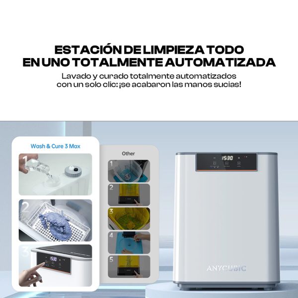 La Anycubic Wash & Cure 3 Max es ideal porque centraliza y optimiza el post-procesado de impresiones en resina (lavado + curado) con gran capacidad, automatización y resultados consistentes — lo que significa que puedes entregar piezas listas para usar más rápido, con mejor acabado y menos esfuerzo operativo.