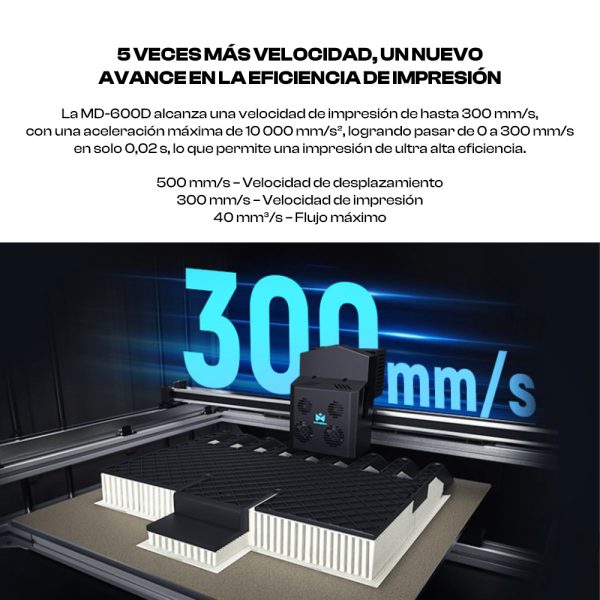 La impresora 3D MD-600D es una potente impresora 3D de nivel profesional con un tamaño de impresión de hasta 600 mm cúbicos. Con su extrusora dual hotend de alta temperatura de 350 grados y sus innovadoras capacidades de impresión rápida, está diseñada para imprimir rápidamente piezas industriales grandes con estructuras complejas utilizando materiales de calidad industrial.