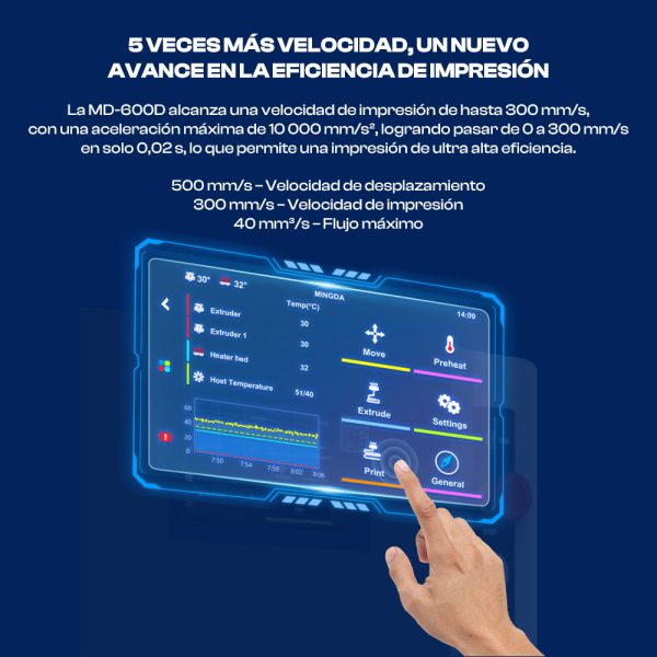 - Velocidad máxima de impresión: hasta ~500 mm/s en picos; velocidad de impresión recomendada ~200-300 mm/s