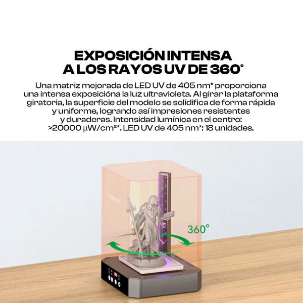 - Curado uniforme 360°: La plataforma giratoria junto con los 18 LEDs UV de 405nm permiten curado desde múltiples ángulos, ayudando a obtener piezas más duras, sin zonas sin curar.