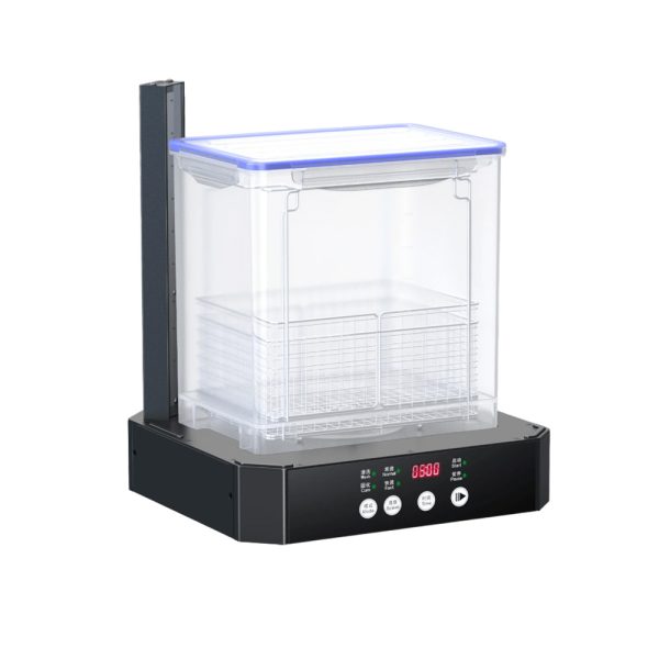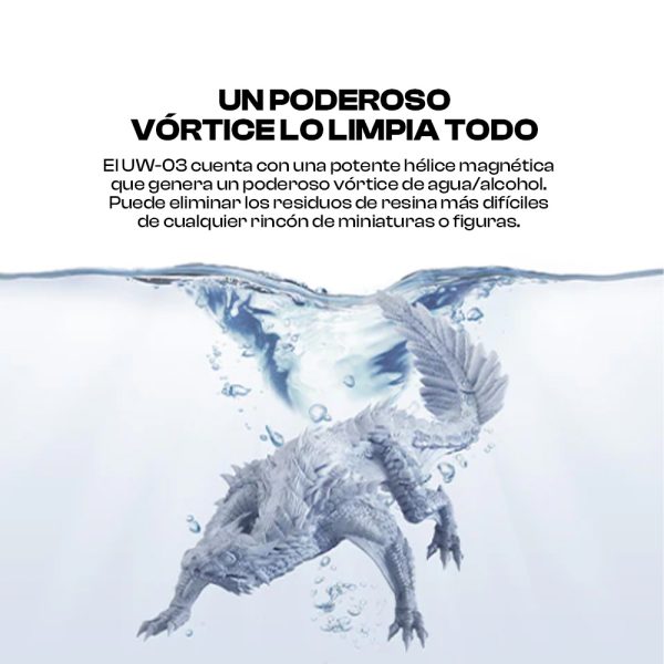- Lavado eficiente con vórtice: Gracias a la hélice magnética de 500 rpm, se genera un remolino que mejora la remoción de residuos de resina endurecida o semi-endurecida en los recovecos de las piezas impresas.