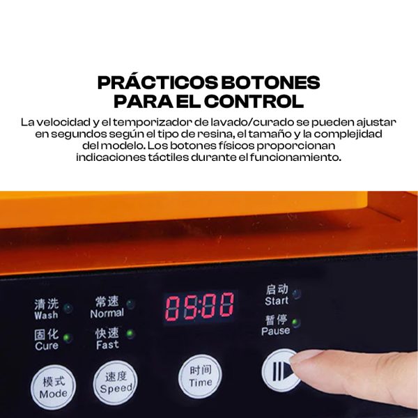 - Temporizador (tiempo ajustable): de 5 a 30 minutos para lavado o curado.